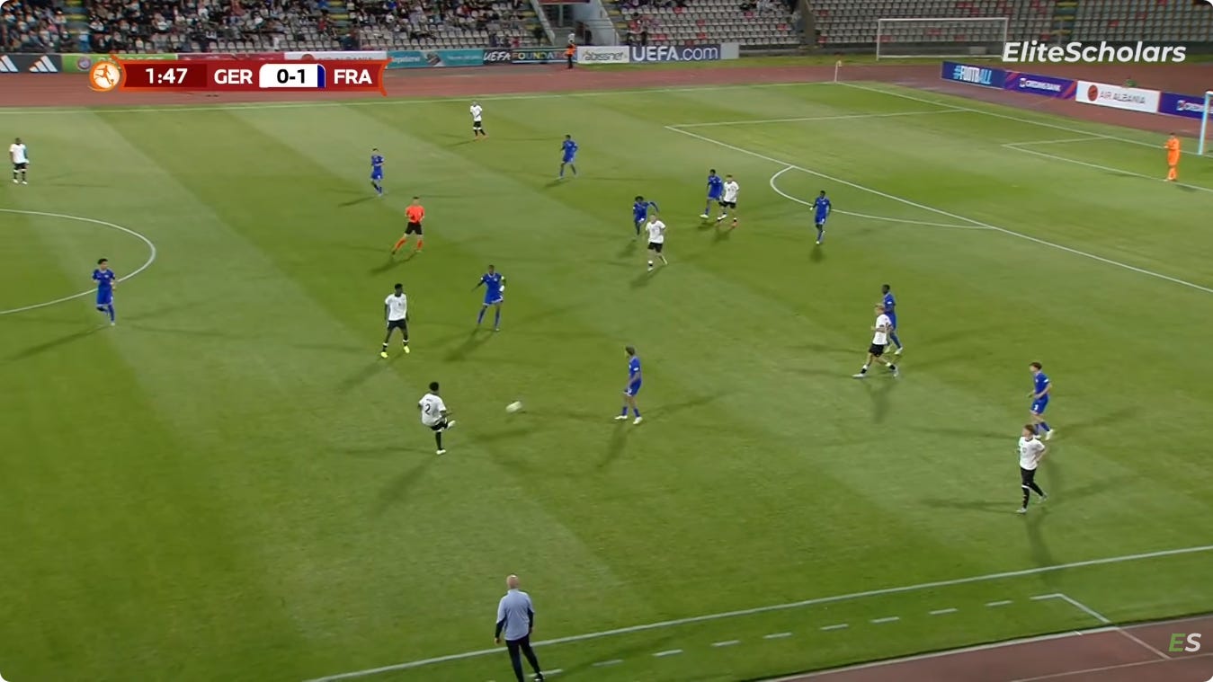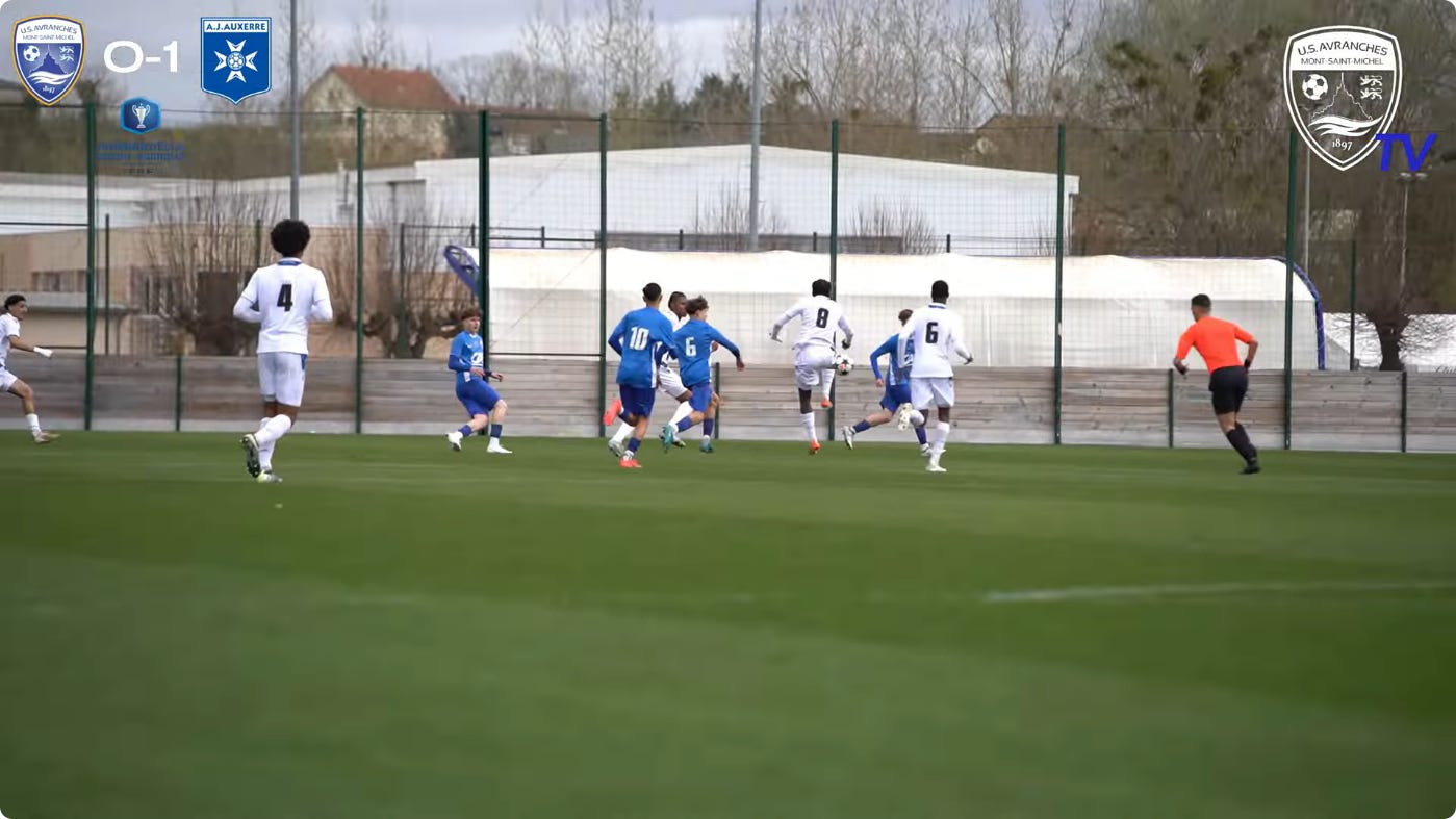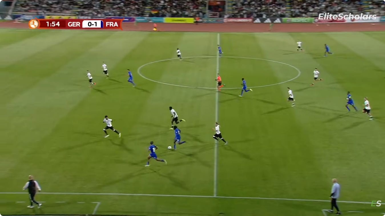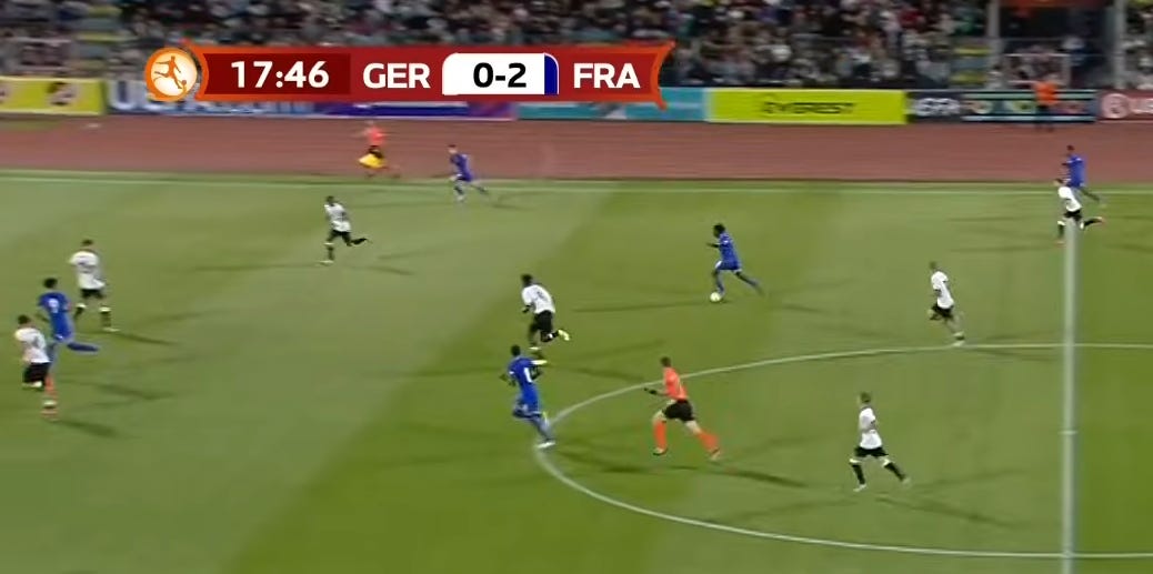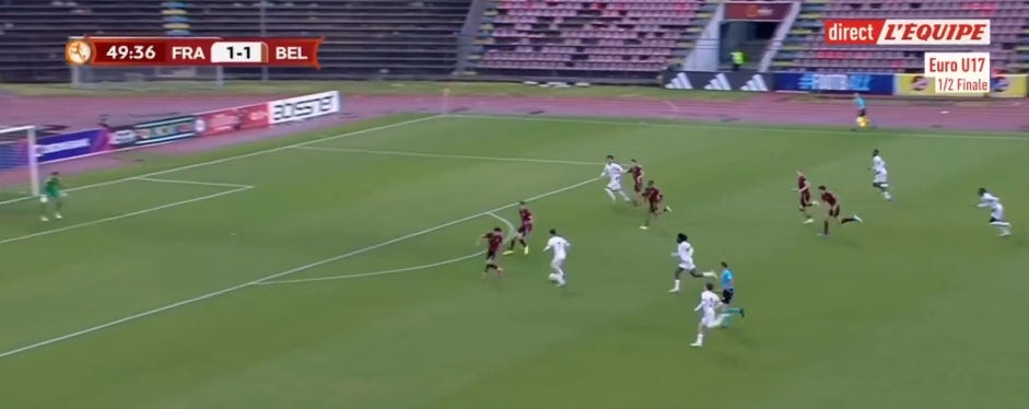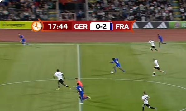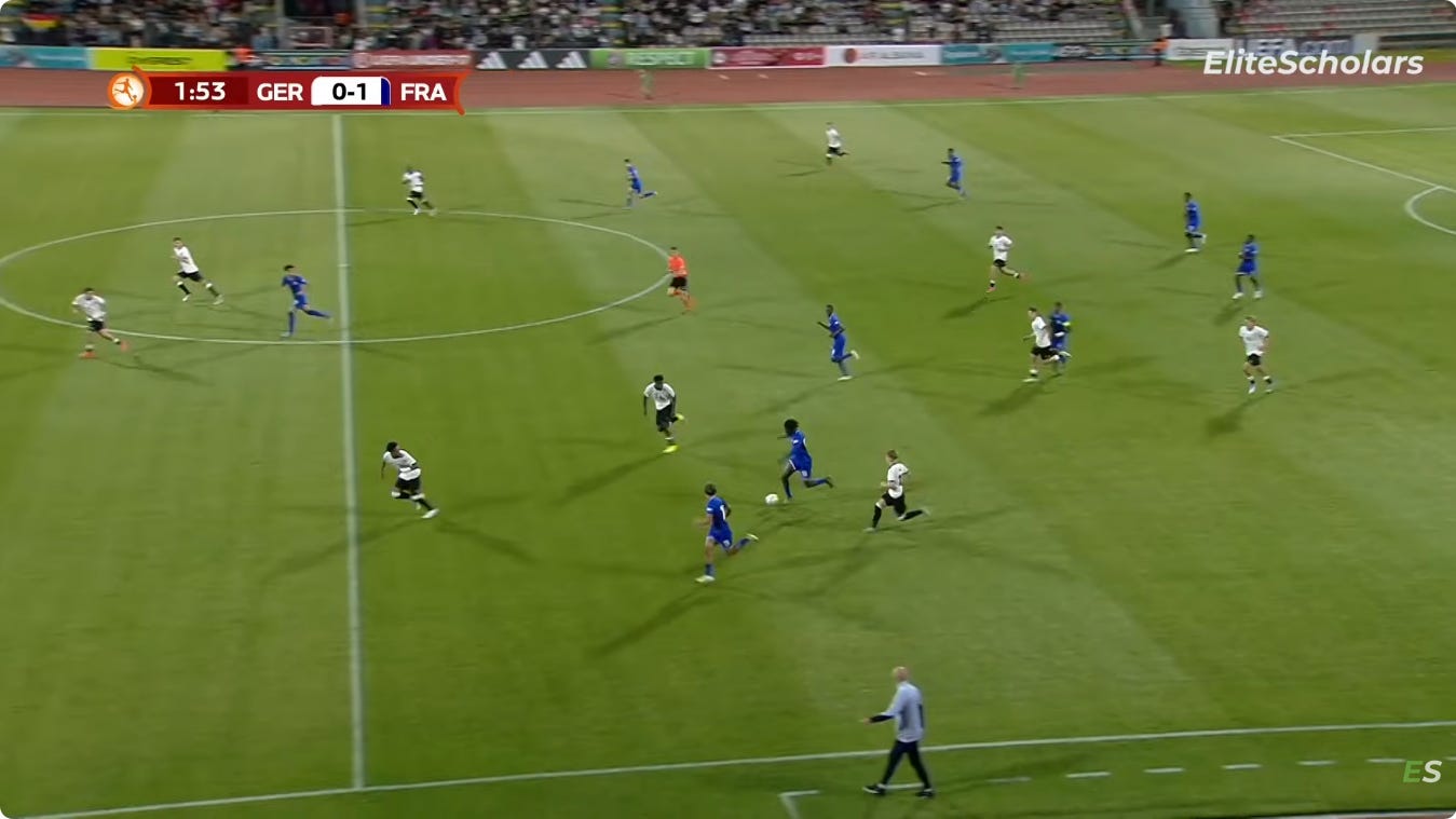 And flair French CMs can be absolutely non existent in duels, to an extent that English academies wouldn’t tolerate. As a result, an unbothered French midfield 3 (whatever the shape, they’ll go where they want - Le Fée, Caqueret, Andy Diouf, Bondo, Aouchiche, Agoume, Abline, Abdoullah Ba etc) can truly look absolute chaos especially on defensive transition.