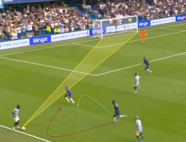 Right, with LW LB in final third and Namaso (Michael Olise’s mate from Reading U21s), Matondo controls the channel to prevent the transition to unfold here.