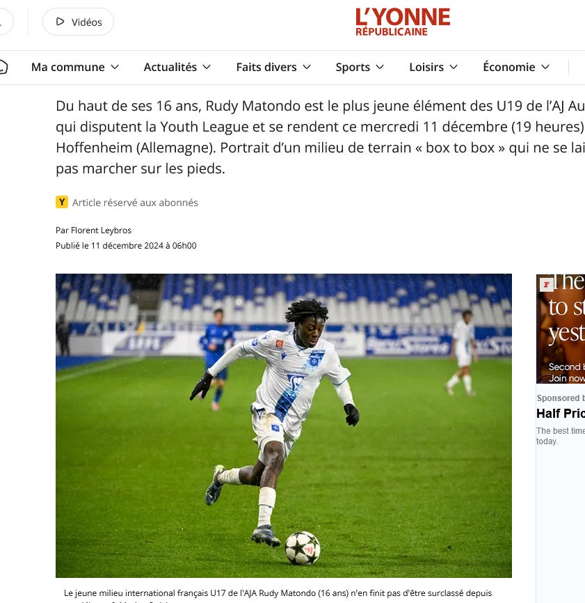 Matondo joined AJ Auxerre from US Grigny at the end of his U15 season in 2023 - the 50km radius cap is lifted when players enter their U16 season, and can therefore join a professional club.
