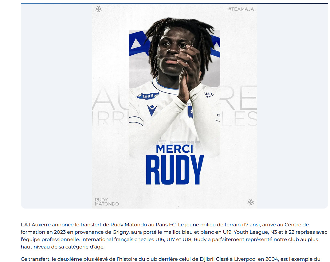 Paris FC decided to invest 17 million on Rudy Matondo in January 2026, which creates a vertiginous outlook for a player who joined AJ Auxerre from US Grigny in 2023 - the regular talent pathway.